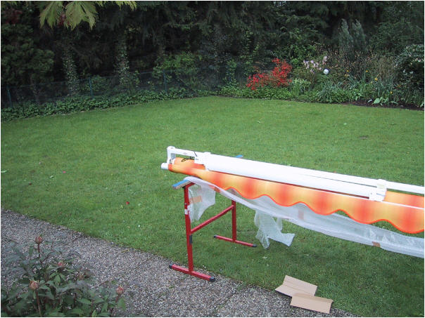 Eine Markise im passenden Dessin für die neue Terrasse ist montagebereit.